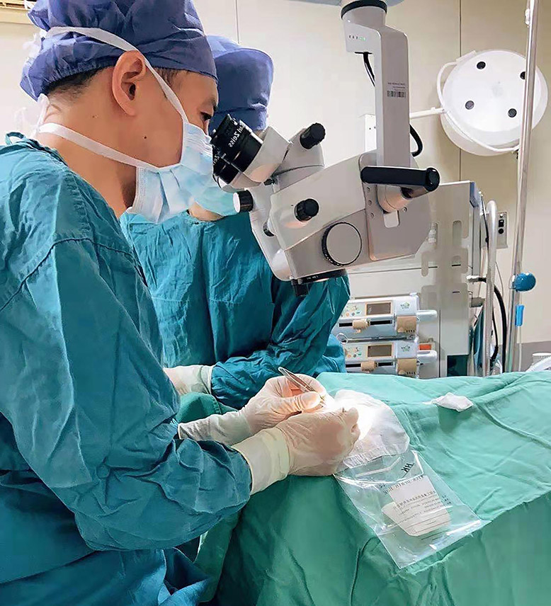 看到這樣一個病情復(fù)雜的病例以及老人無助期待的眼神,作為一名有著多年黨齡的眼科醫(yī)務(wù)人員,雖有些猶豫,但醫(yī)生的職責(zé)告訴自己:只要有1%的希望,就要做100%的努力。楊愛民帶領(lǐng)眼科團(tuán)隊詳細(xì)研究病情,分析了術(shù)中術(shù)后可能出現(xiàn)的各種情況,并邀請?zhí)悄虿】萍澳I內(nèi)科醫(yī)生對患者的全身狀況進(jìn)行綜合評估。經(jīng)過充分準(zhǔn)備,楊愛民為患者在局麻下實施了“右眼虹膜囊腫切除+瞳孔放射狀切開+白內(nèi)障超聲乳化+折疊式人工晶體植入術(shù)”。手術(shù)順利,術(shù)后第二天患者視力檢查結(jié)果為0.15,讓患者及其家人露出了久違的笑容。
